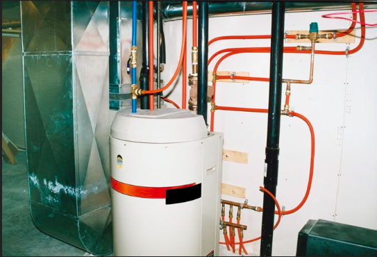 - Kitec on a hot water tank. Piping is typically blue for cold water and orange for hot.