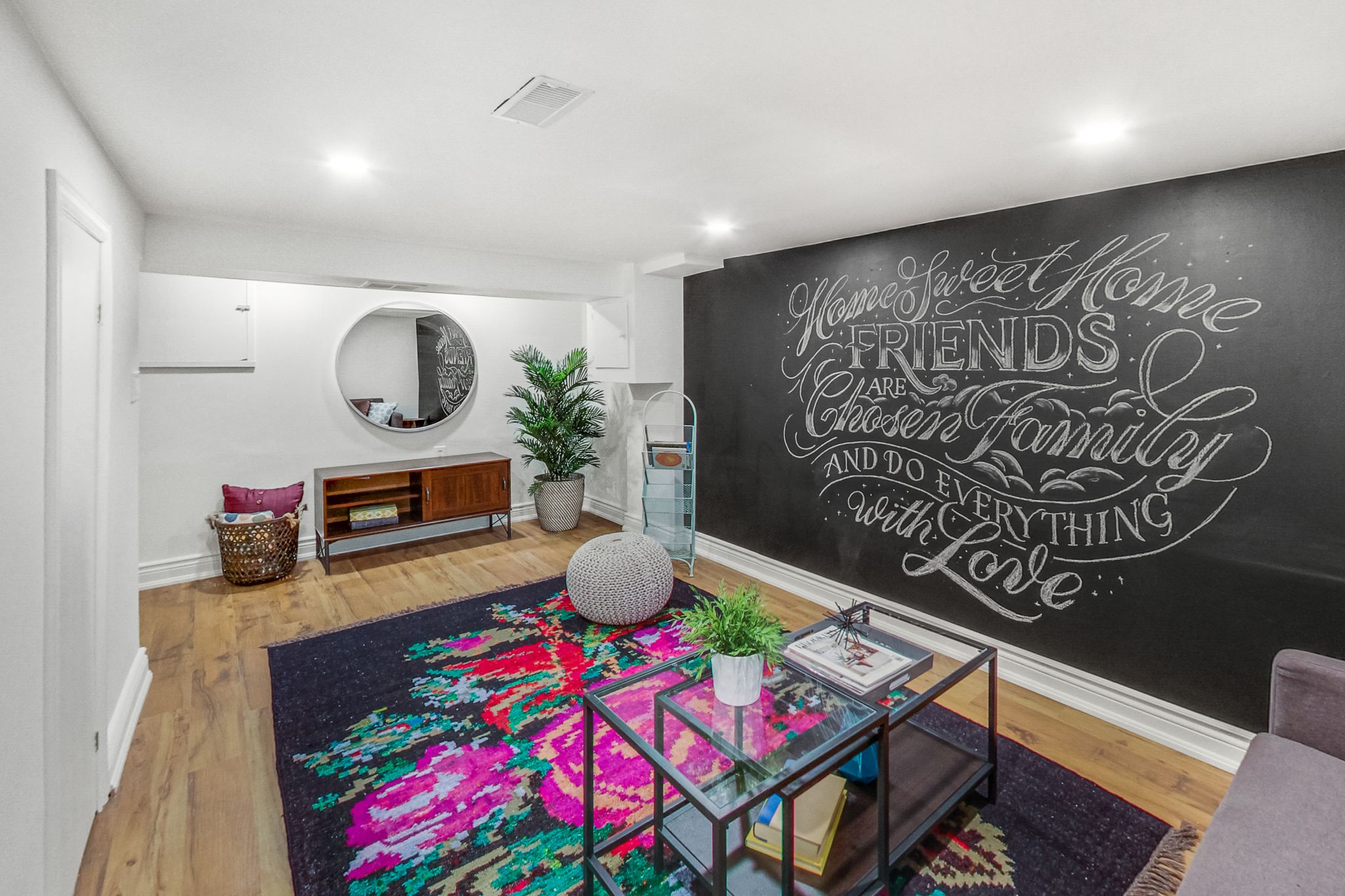 H: We were really proud of the staging for this home. We worked with our wonderful UpStaging team to make sure that we got every detail right. We even brought items from our own homes that we felt would add to the charm. Every room told a story! We commissioned a chalk artist to draw/write a beautiful quote on a chalk art wall that further inspired family living and created a jewel of a powder room with some really fun wallpaper. This was a fun project but it really required us all to work together as a team to paint the vision.