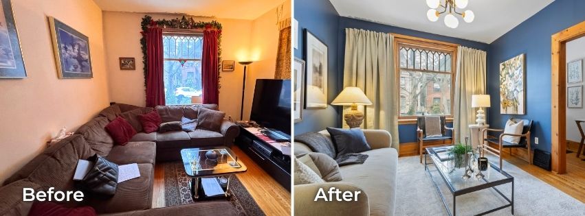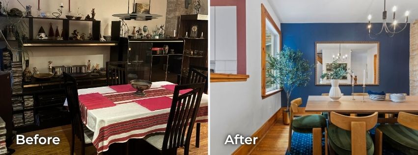On January 14, our staging team, led by designer Kiel Storms, visited the home for a consultation. Kiel saw an opportunity to lean into the home’s character and suggested some bold colour choices to highlight its personality and complement the warm wood tones throughout the house.