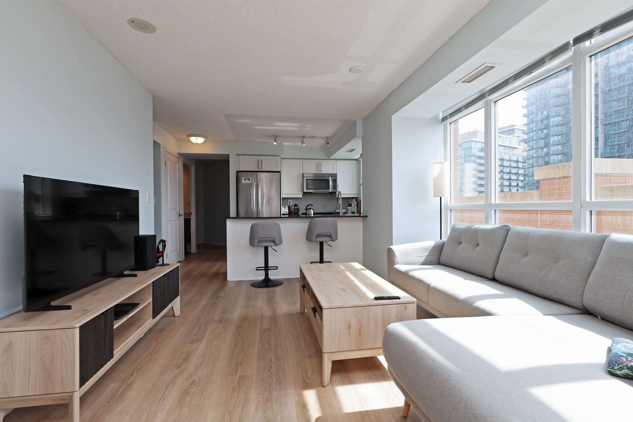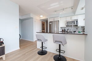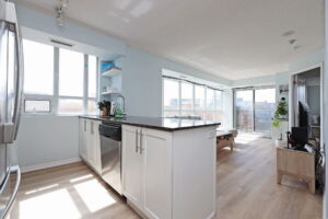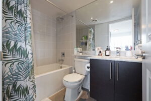 The kitchen is clean and contemporary, with quartz counters, stainless steel appliances, and a breakfast bar that works just as well for quick weekday meals as it does for casual entertaining. Just off the living space, a private balcony extends your living area outdoors – perfect for a morning coffee or winding down at the end of the day.