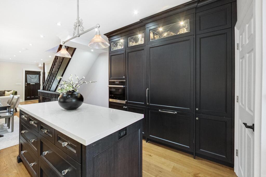 The dining room is open to a kitchen that would make the chefiest of chefs jealous. Everything here is top-notch and high-end. How do we love this kitchen? Let us count the ways: a six-burner Wolfe dual-fuel range with a pot-filler, Miele Combi-Steam Oven, refrigerator, and dishwasher, an island with a quartz countertop and power outlet, and tons of storage to savor. There’s even a farmhouse sink with a vintage-inspired faucet. Through patio doors is a cozy backyard landscaped to provide the utmost privacy. A laundry room rounds out the offering on this level.