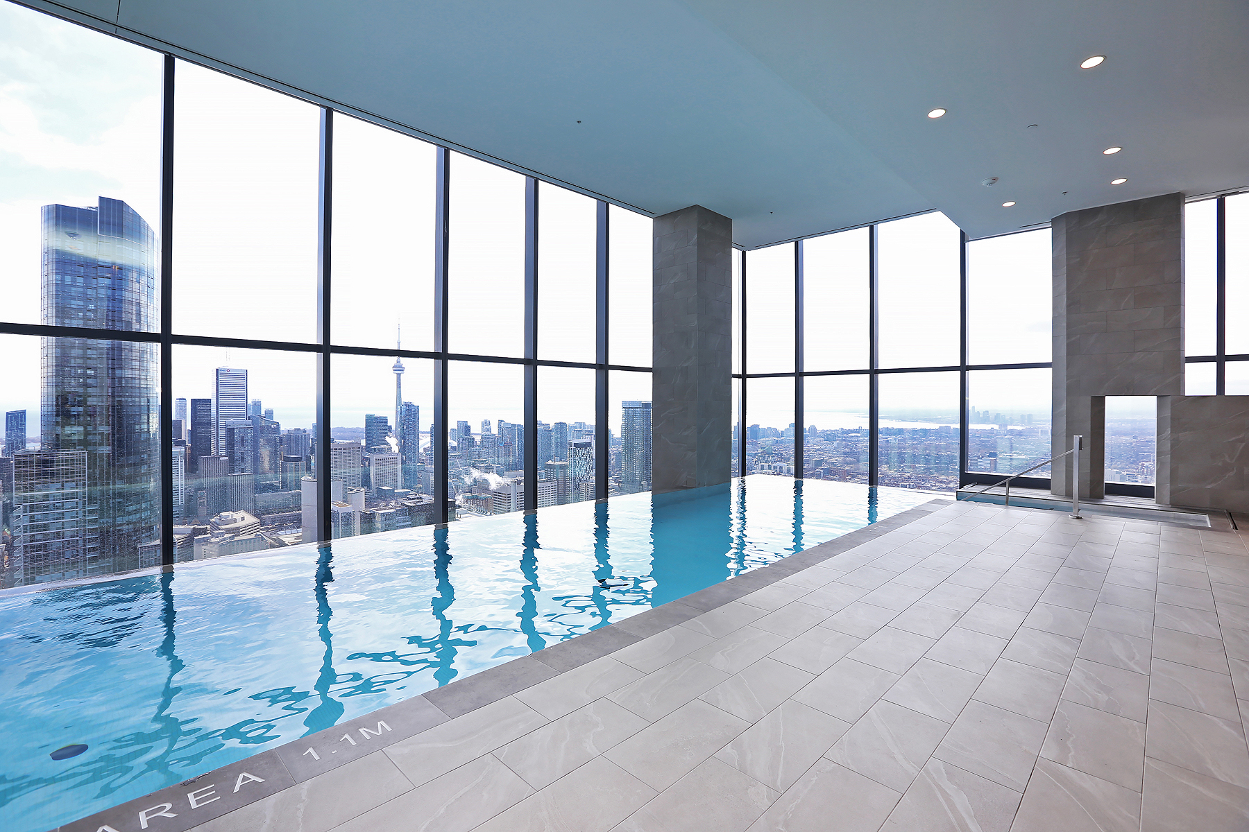 This is a sharp looking building. From the lobby to the 66th floor, this building has style for days. International Interior and Design Firm Burdifilek, who also worked on swoony projects like W Hotels, Holt Renfrew and Club Monaco New York, have created a memorable aesthetic for the building you’ll be proud to call home. Amenities include a concierge, gym, meeting room, party room, rooftop deck and visitor parking. The coolest thing – in our humble opinion – is the infinity pool, located on the 66th floor. Seriously, you need to head up and have a look if you’re in the building.