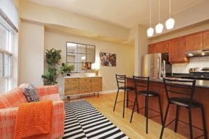 The airy feel continues on the first floor. Here, you’ll find a living room and dining space flooded with natural light. The open kitchen, with stainless steel appliances and an island that seats three, is perfect for entertaining. This floor also has a powder room which is a lifesaver for those with kids in the home and those who can’t wait to fill up their social calendar with gatherings and get-togethers.