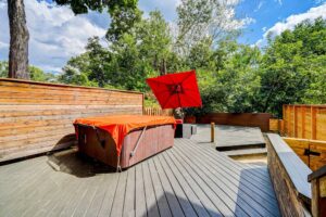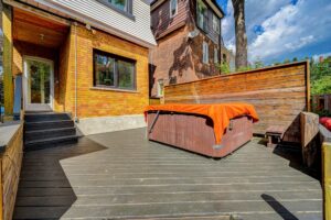 A two-tiered deck extends your living space outdoors, complete with a hot tub—an ideal setup for relaxing evenings, weekend gatherings, or simply enjoying the natural surroundings year-round.