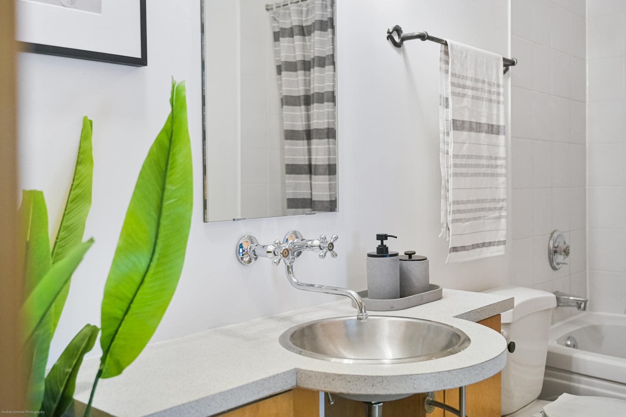 The small details in the ever-so spacious bathroom really tie the sexy industrial flair throughout the home. Bold blue floor tiles are complemented by a custom stainless steel sink and twin overhead shower fixtures. Did I mention the bathtub is roomy and has jets? Seriously, everything here.