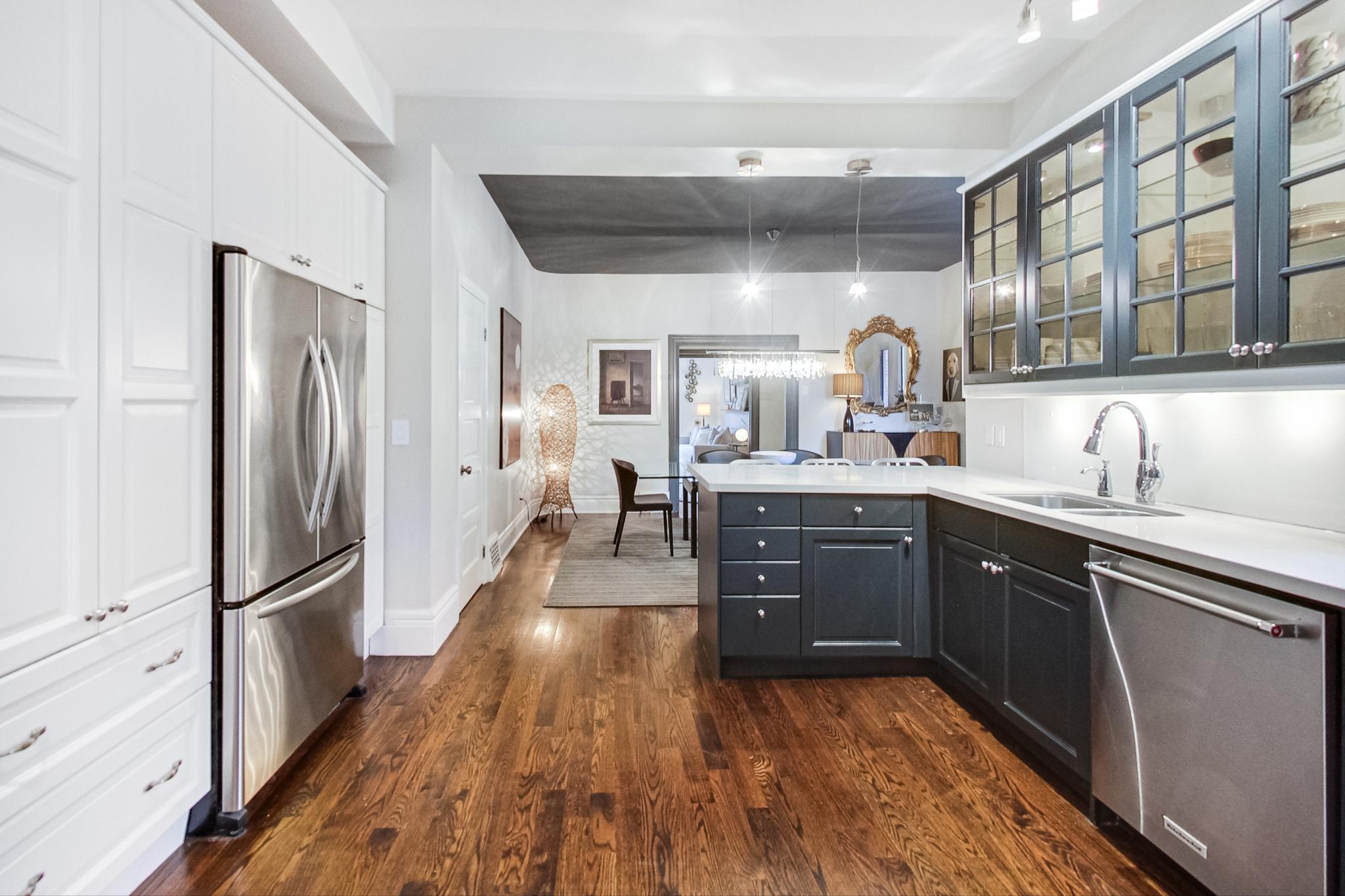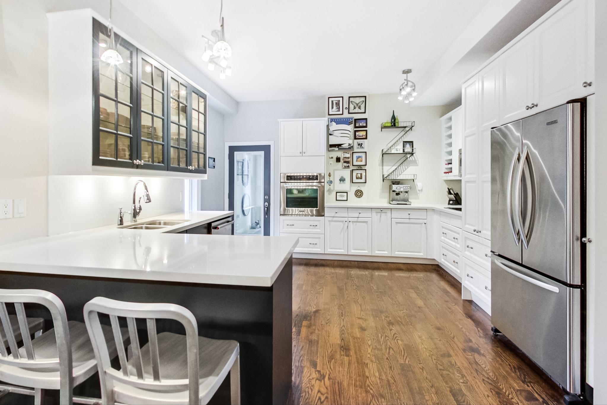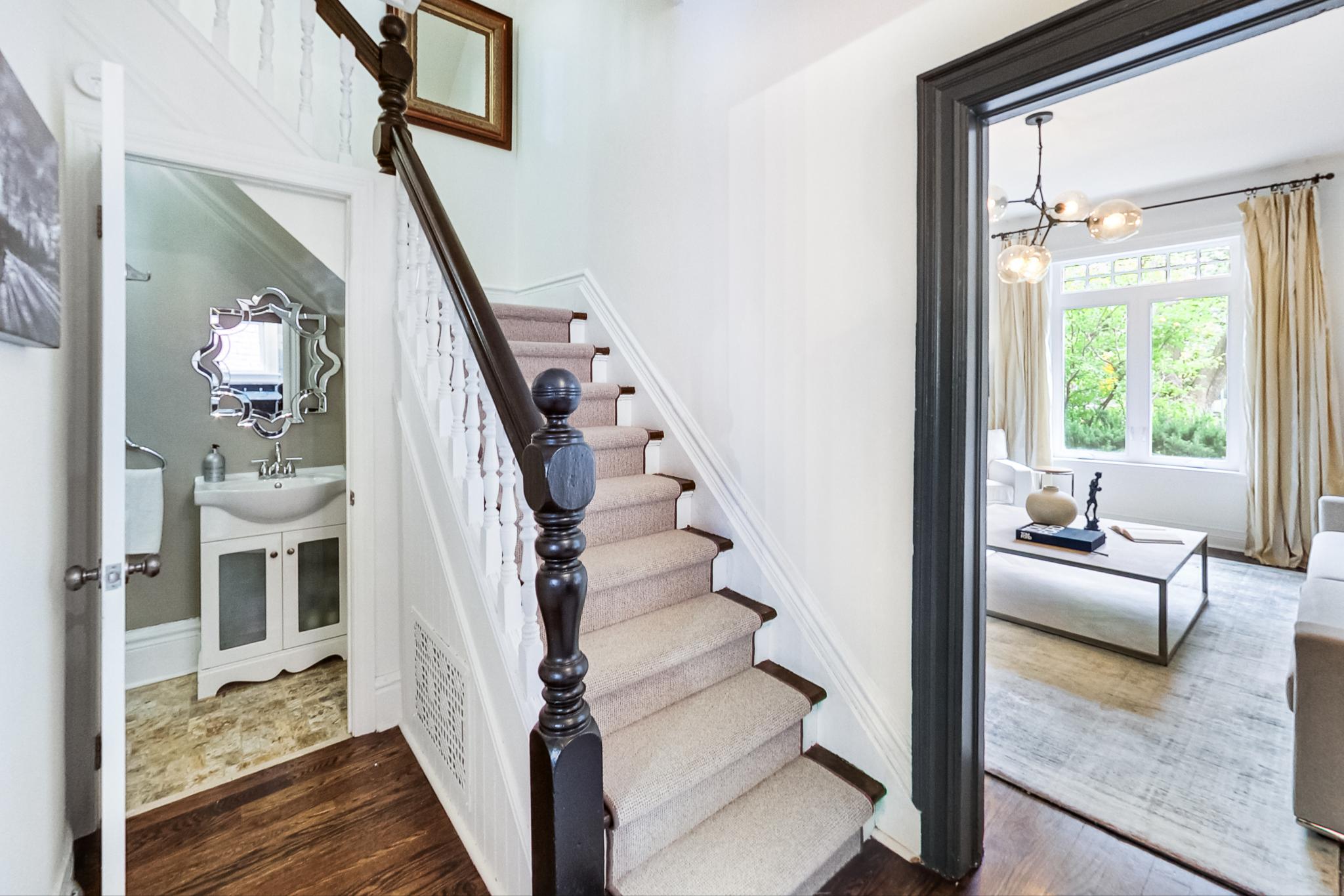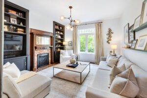 The formal front entrance opens to the grand main floor with its 10 foot ceilings, rounded walls and classic big windows. To the right is a front (living) room to die for — with an original Edwardian fireplace, flanked by dramatic floor-to-ceiling built-ins. The huge south-facing window lets in tons of light and, when the windows are open, the sound of children playing in the school playground across the street. The sightlines through to the dining area and chef’s kitchen are excellent.