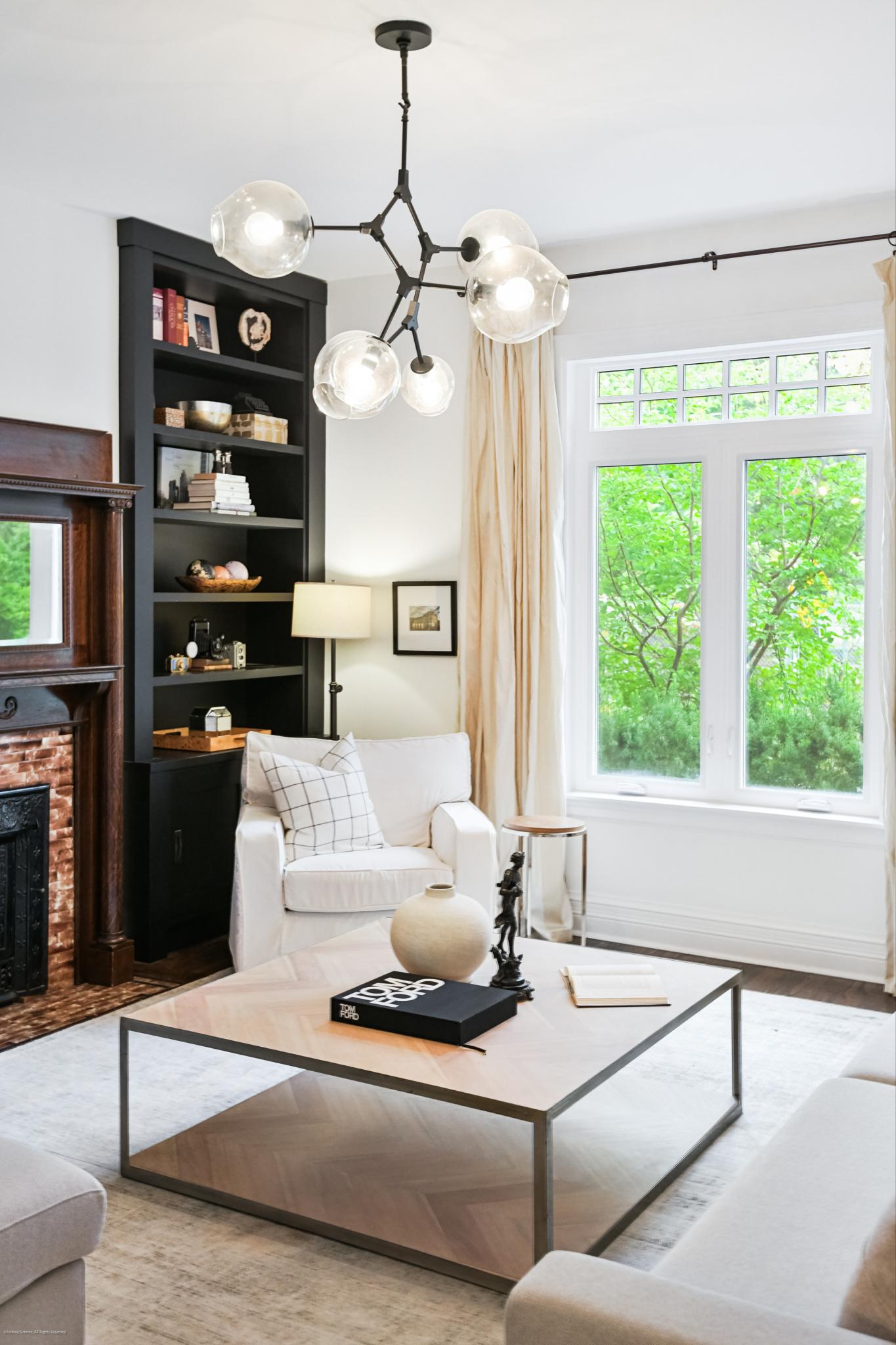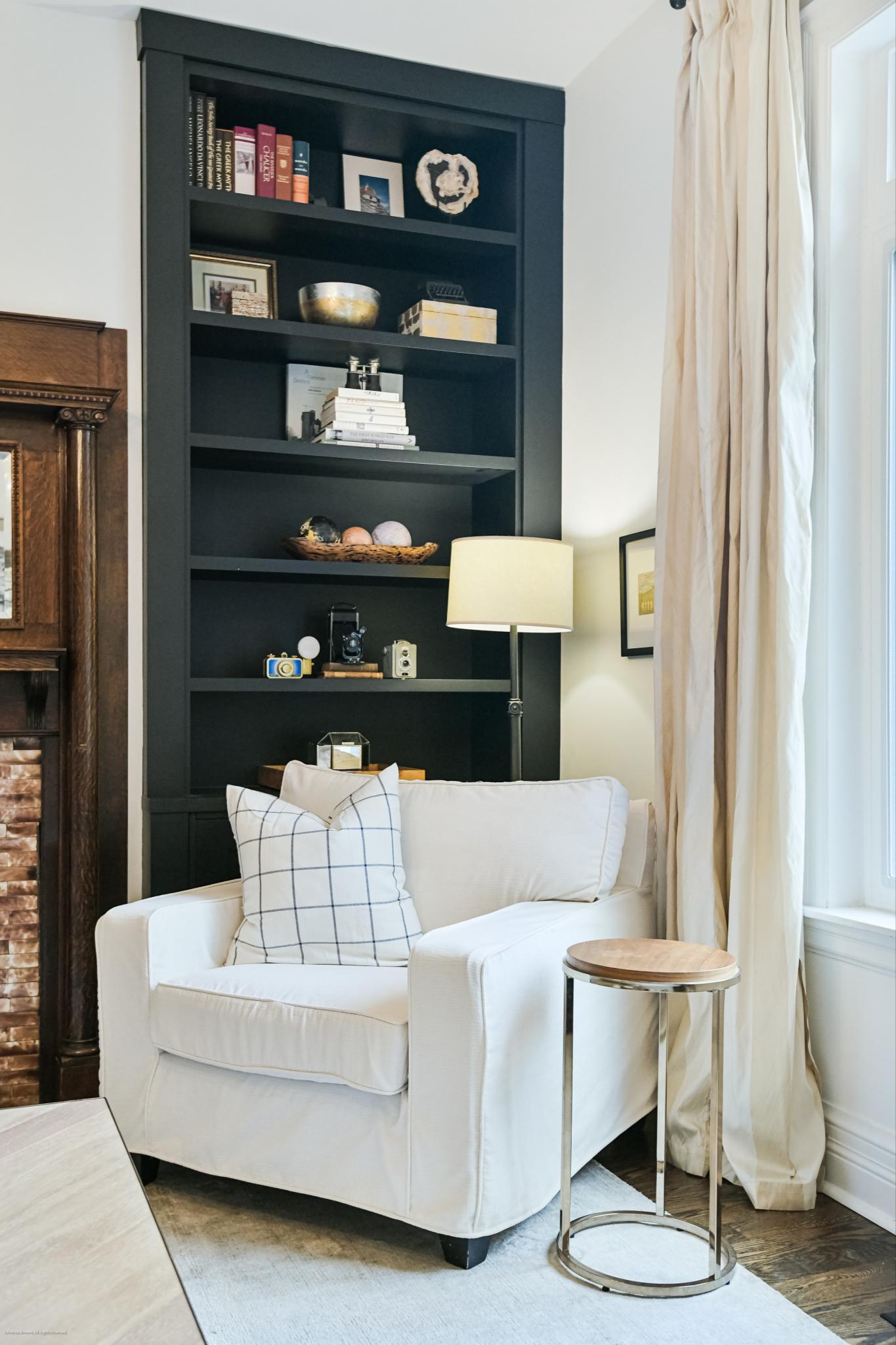 - The front room. OMG. The front (living) room!!! With its 10-foot ceilings, original Edwardian fireplace flanked by dramatic floor-to-ceiling built-ins and a huge south-facing window, this space is something you don’t see often.