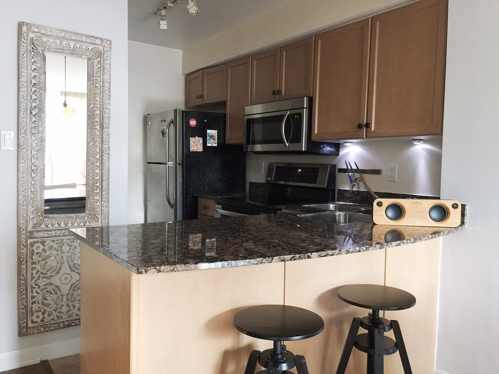- Modern kitchen with stainless steel appliances with granite counter tops and breakfast bar