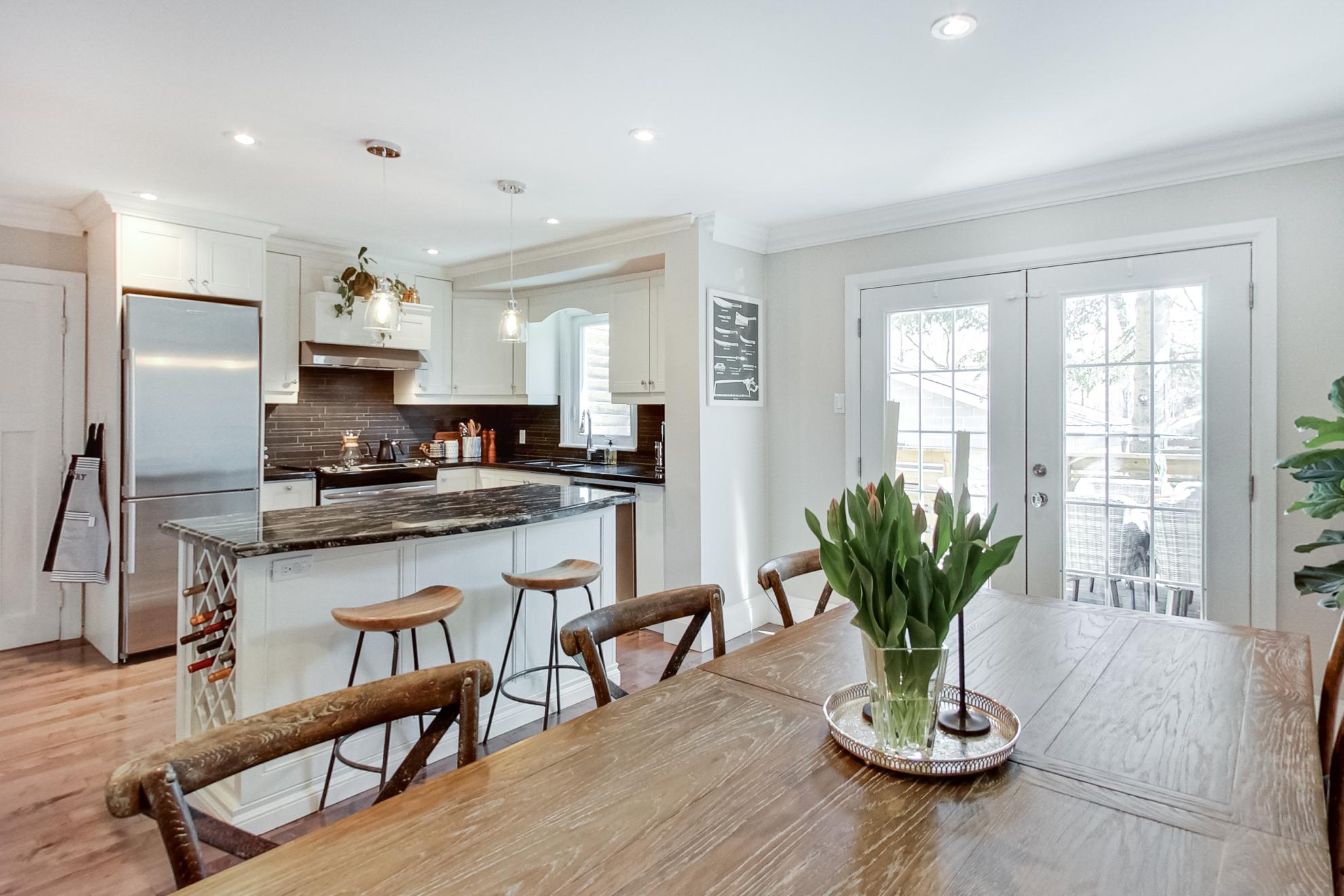 This floor also features a powder room, side entrance to the basement and a beautiful french door walkout to the deck and backyard beyond.