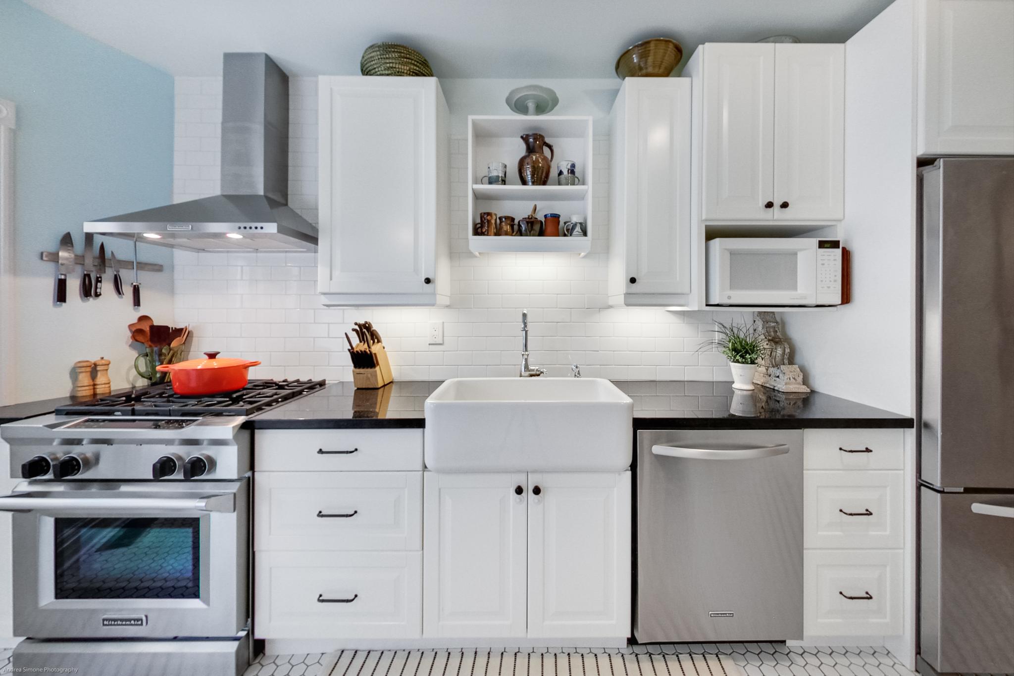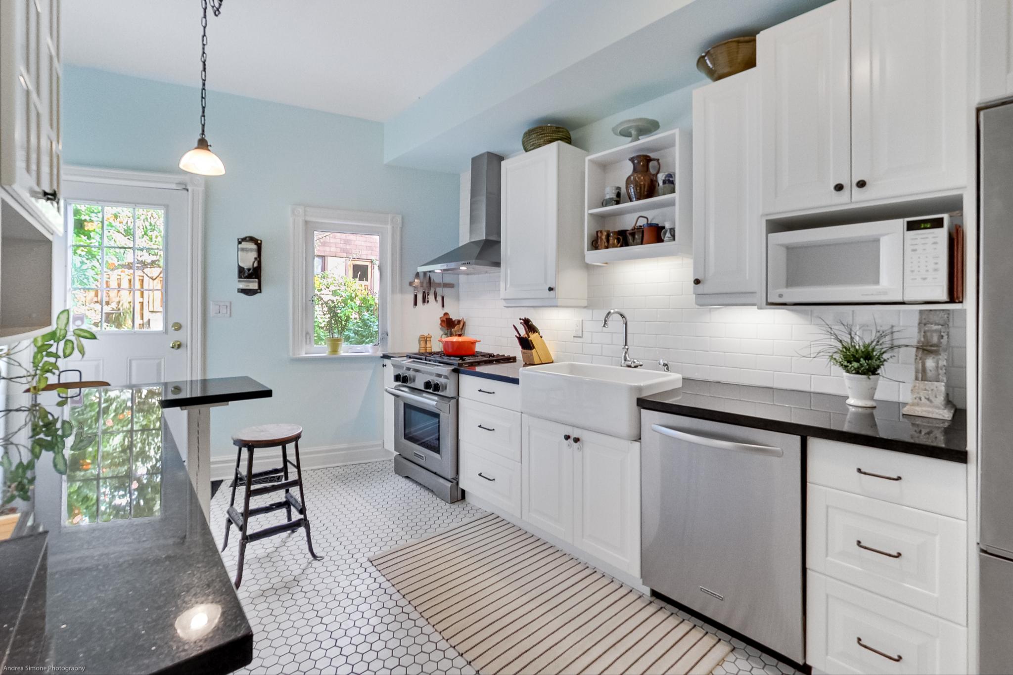 The brick facade and porch offer a welcoming entrance into a living space featuring stained glass windows and original hardwood, plus plenty of other vintage elements that come from being 130 years old. Original millwork frames the windows and doorways, leading your eye to the kitchen. Designed and completely rebuilt by foodie owners, it has a glorious gas range, farmhouse sink, breakfast bar bathed in natural light and a remarkable amount of storage for a home this size. Everything, from the design choices to the tile work is perfection.