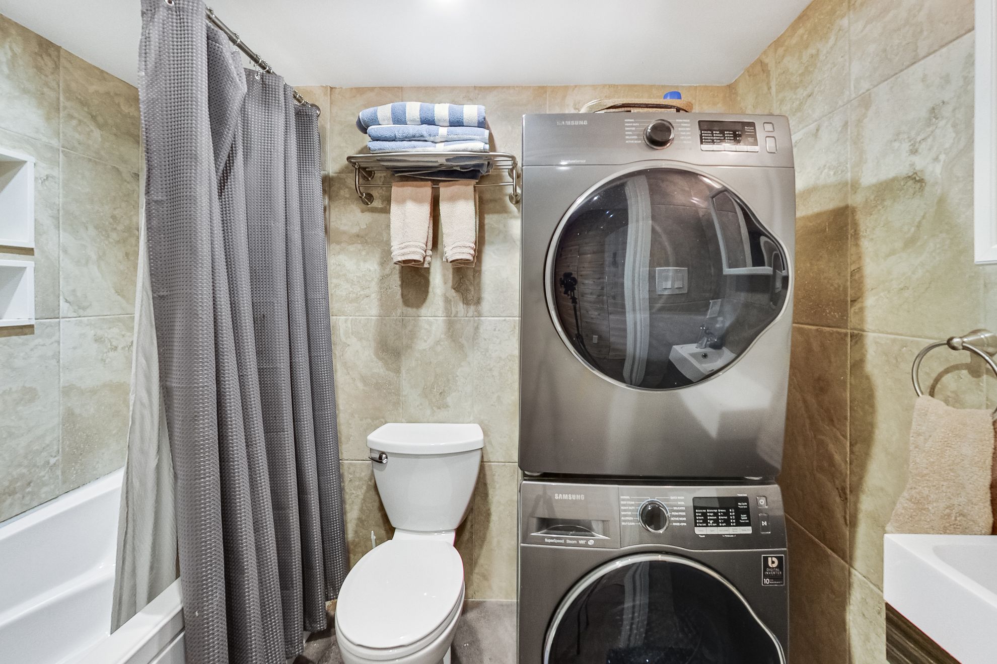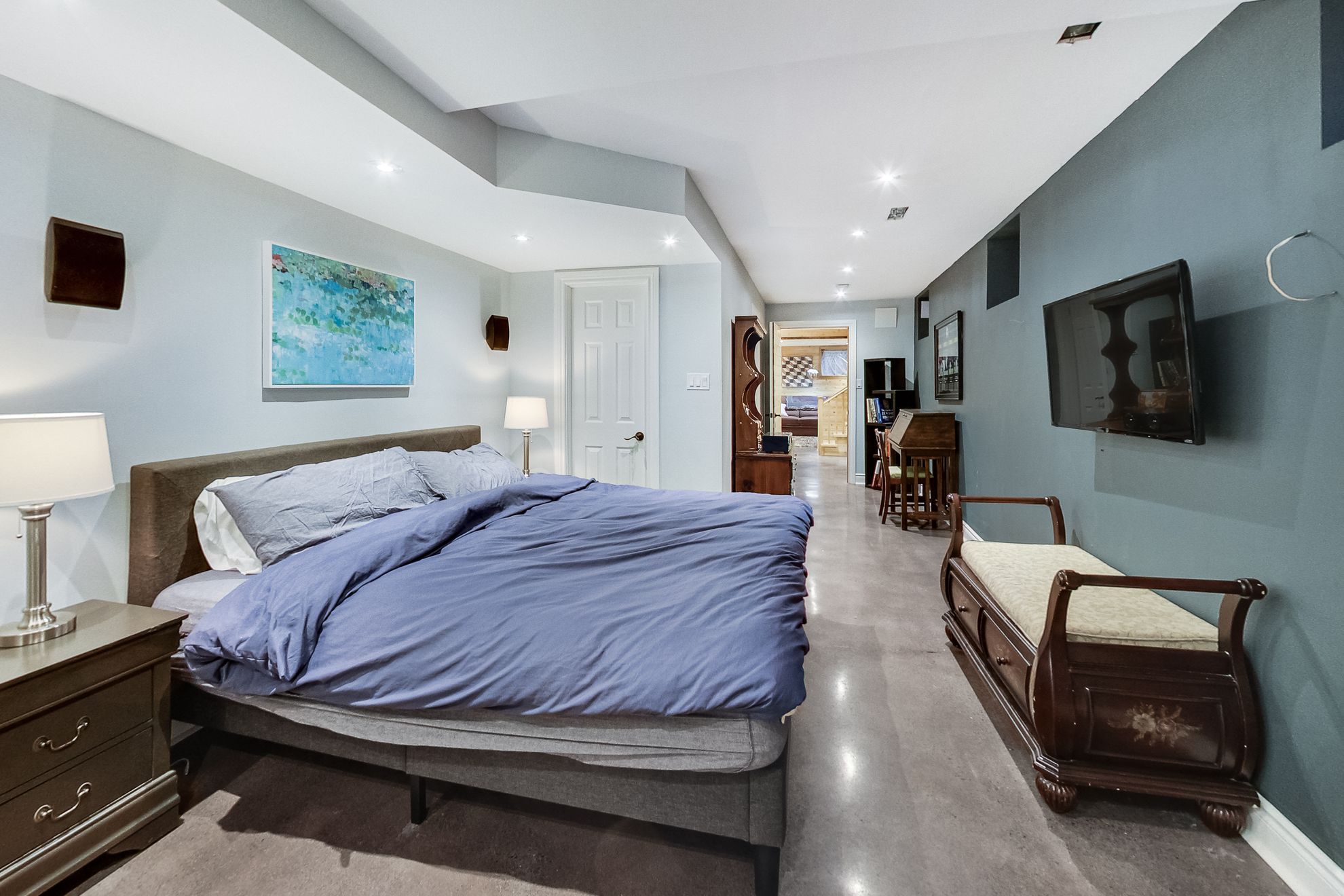 Downstairs, the show continues with the basement. This space can be a self-contained unit. There’s a separate entrance, 8ft ceiling height, with polished concrete floors and separate bedroom, living room, kitchen, bath, and laundry.