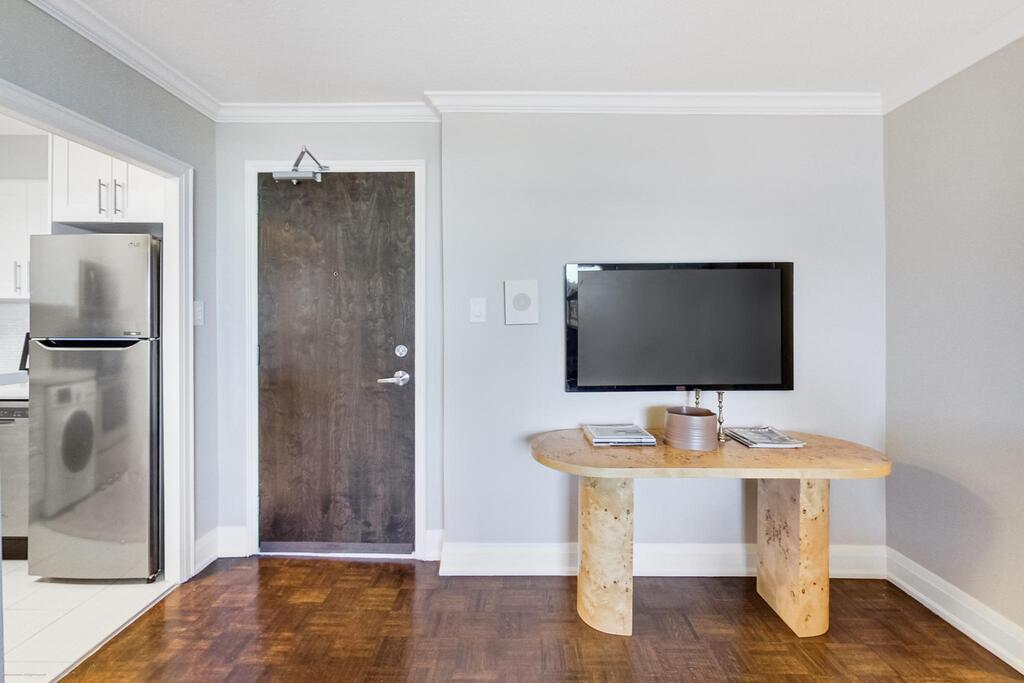 Renovated in 2017, this suite has the kind of warmth and functionality that’s hard to find in newer builds. Espresso-hued parquet floors add depth and character throughout, while crown moulding brings a tailored finish to every room. The kitchen has been thoughtfully updated with modern finishes that make everyday living easy, and the bathroom feels crisp and contemporary.