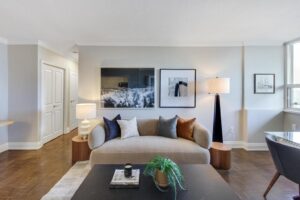 - Real Space, Real Comfort. With more than 950 square feet, two full bedrooms, and a den, this home feels like a proper residence—not a condo compromise. The thoughtful 2017 renovation brought warmth, functionality, and character through espresso parquet floors, crown moulding, and updated finishes throughout.