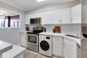 An in-suite washer/dryer combo adds convenience, and the rough-in for air conditioning is already in place behind the crown moulding. The building is also Bell fibre-ready for high-speed internet.