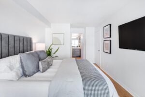 The Queens Harbour twin buildings are located near the intersection of Queens Quay West and Dan Leckie Way in Toronto’s Waterfront neighborhood. The two 11-story towers embody a nautical vibe, mimicking an oceanic cruise ship with their white concrete and pale blue tinted glass exteriors. The luxurious amenities include a gym, sauna, party room, and ample visitor parking in the parking garage.
