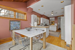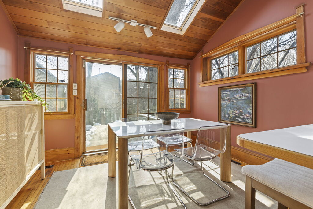 - The Skylit Breakfast Room at the Back. The rear extension is where daily life naturally gathers. South-facing windows and two skylights draw light deep into the home, and sliding glass doors lead straight to the deck. It works as an eat-in kitchen, a casual family room, or a homework hub just off the main living space. It is bright, flexible, and easy.