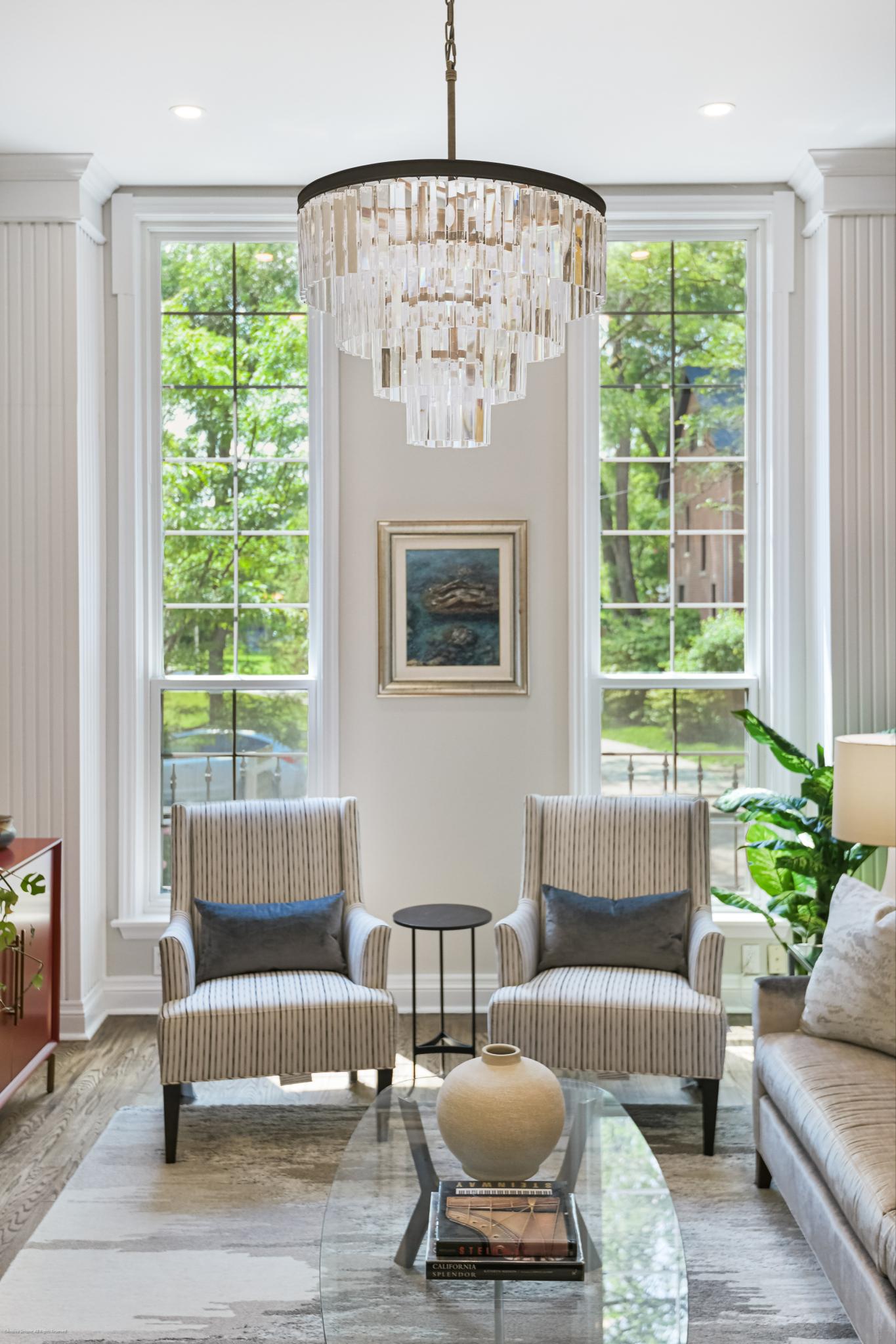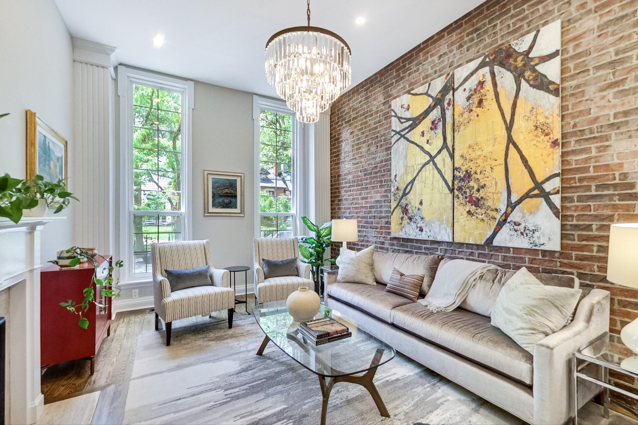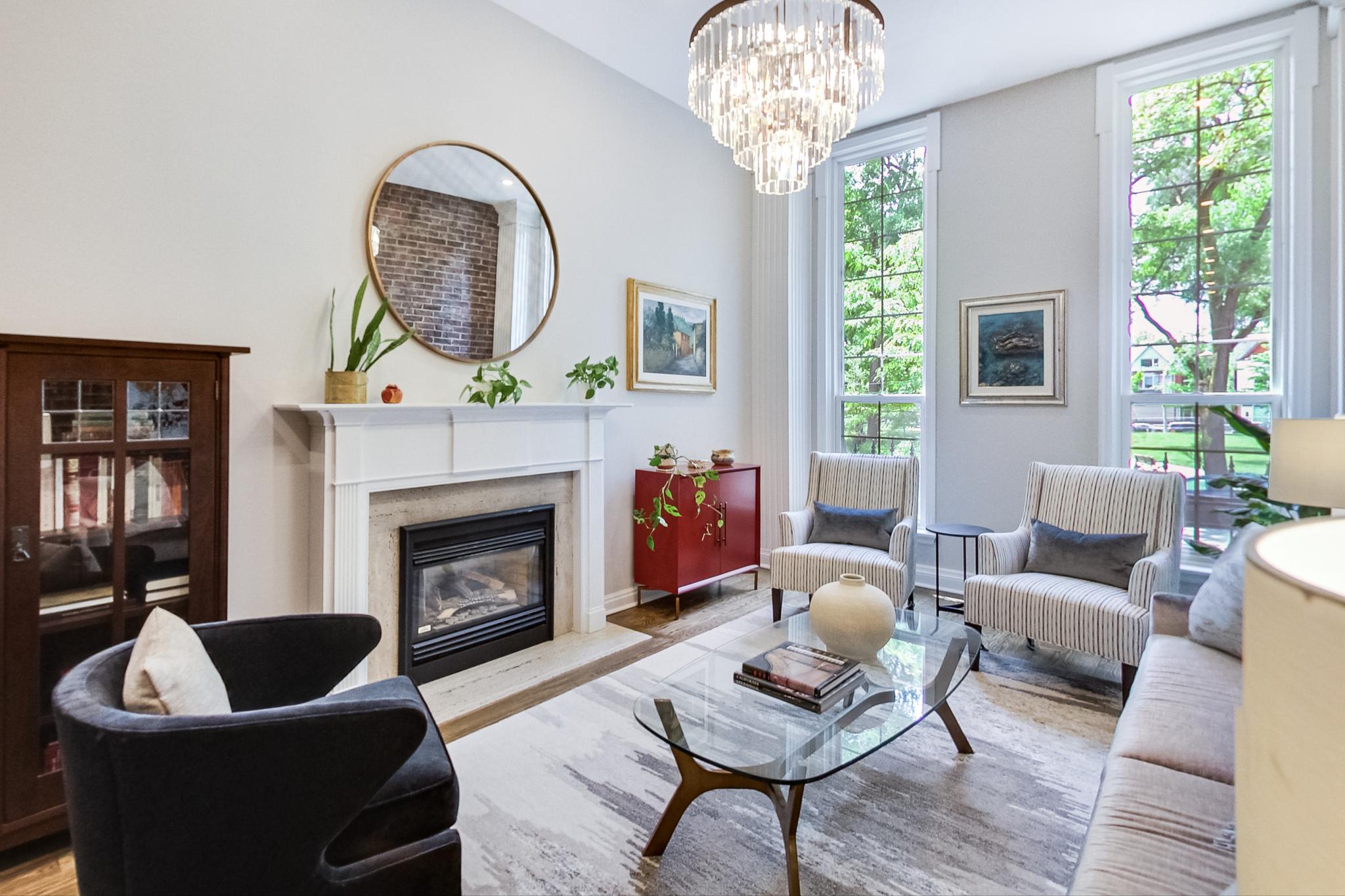 - The elegant living room with 11 ft ceilings, exposed brick wall and gas fireplace. The large windows offer picturesque views of the lush green park across the street.