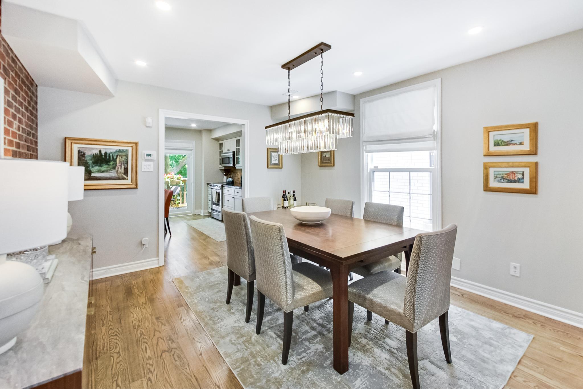 The main level boasts a unique, open split layout, perfect for both daily living and entertaining. The exposed brick wall is carried into the dining room, adding a timeless and tasteful touch to the space. The renovated, eat-in kitchen is a culinary haven, complete with modern appliances and a charming walkout to a balcony overlooking the backyard.