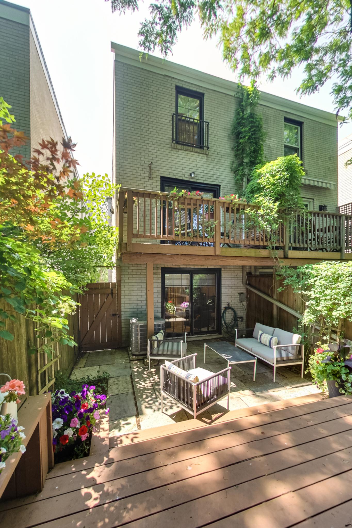 - The low-maintenance backyard is a serene and tranquil haven, shaded and covered in lush greenery, complete with a stone patio and deck featuring built-in seating.