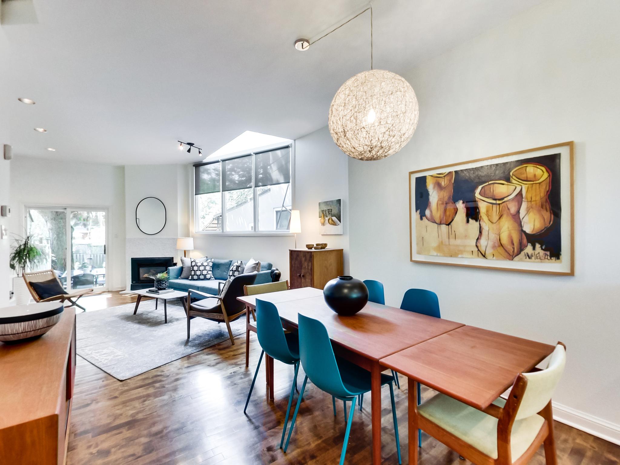 Located between Annette and St. Johns on a beautifully tree-lined street, you’ll find this 2.5-storey Victorian semi. The exterior is everything you’d want in a classic Victorian – red brick, pointed roof, lots of charm — while the interior is everything you would want in a contemporary home. Step through the doors to the open concept main floor with its hardwood floors and 9’8” ceilings. The kitchen is open to the dining/living space and features very large windows that bring in a ton of natural light. There’s plenty of counter space, stainless steel appliances and room to move. The kitchen overlooks the living and dining rooms with expansive windows, a skylight and a gas fireplace to warm the space literally and figuratively. There is also a main floor powder room (the Holy Grail of Toronto real estate).