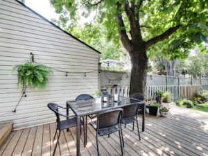 The backyard is truly exceptional. An expansive deck, accessed from the living room walkout is perfect for summertime meals and gatherings under the canopy of mature trees, and a yard made for the green thumb of the family. It’s fully fenced for privacy and parking for two cars hides just behind the back fence, accessed from the laneway.