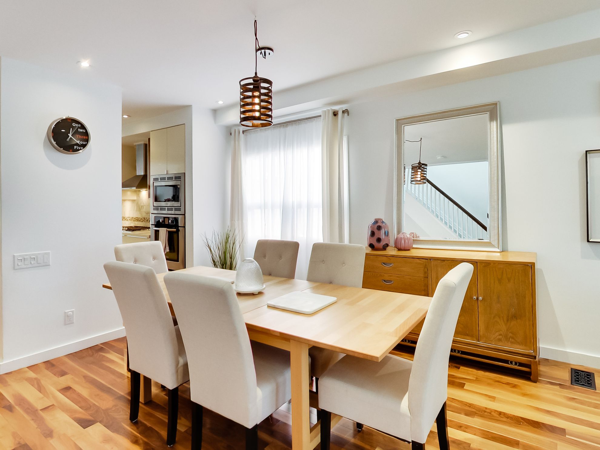 The kitchen. Modern, open-concept, with high-end integrated appliances, a huge centre island, and adjacent dining room.