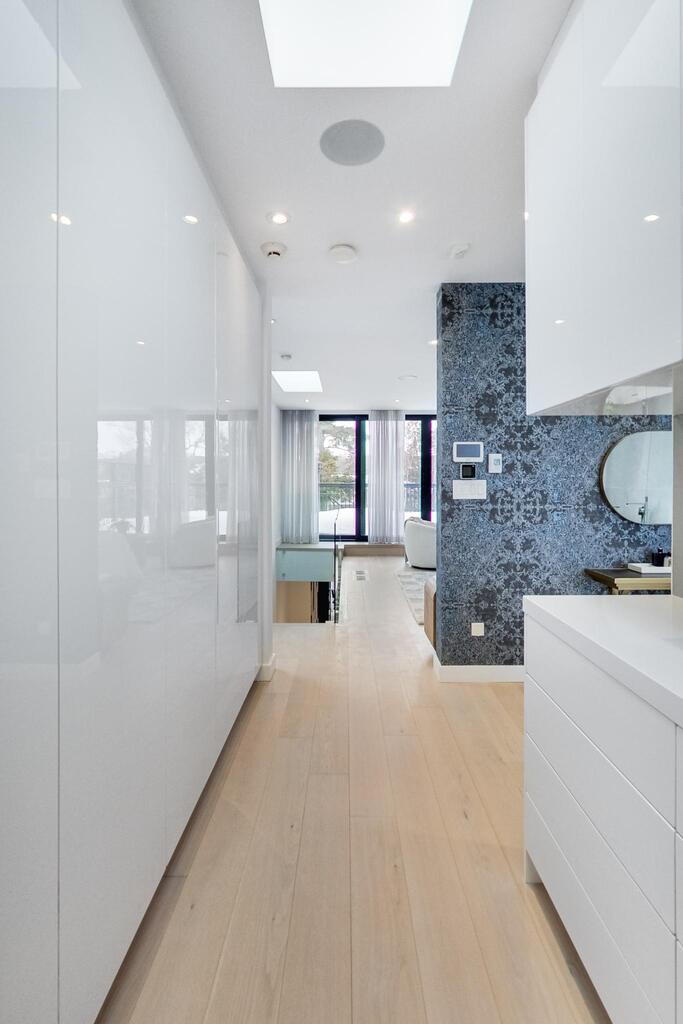 3. The Third-Floor Primary Retreat. An entire level dedicated to the principal bedroom changes how the house lives. Upstairs, a walkout terrace looks out over mature trees. Inside, there’s a substantial walk-in closet and a sleek ensuite with a floating tub and frameless glass shower. It’s private, quiet, and distinctly separate from the rest of the household—an actual retreat, not just a larger bedroom.