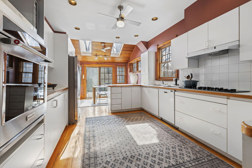 - The Skylit Breakfast Room at the Back. The rear extension is where daily life naturally gathers. South-facing windows and two skylights draw light deep into the home, and sliding glass doors lead straight to the deck. It works as an eat-in kitchen, a casual family room, or a homework hub just off the main living space. It is bright, flexible, and easy.