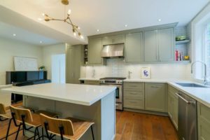 - Renovated kitchen with centre island, quartz counters, and stainless steel appliances