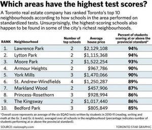 The Toronto Star wrote a story about a Toronto real estate brokerage that compared neighbourhoods and EQAO test scores: Want to Buy into a Top School? As non-parents, we were intrigued. And we wanted the rest of the story. Do EQAO school scores matter when buying a home? A TDSB teacher responds.