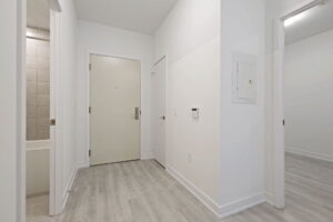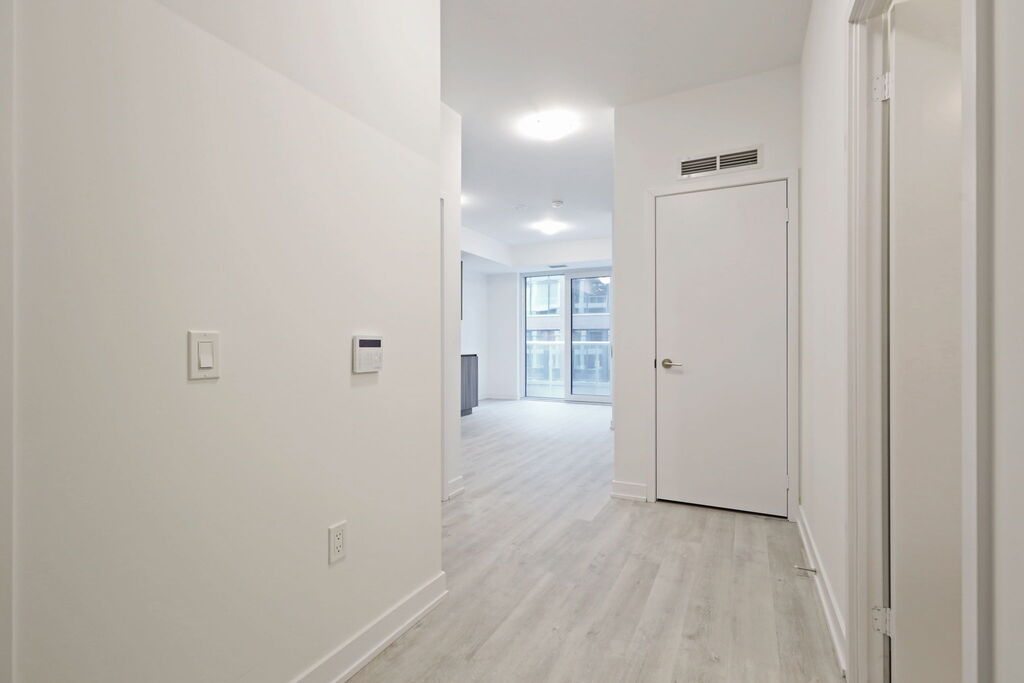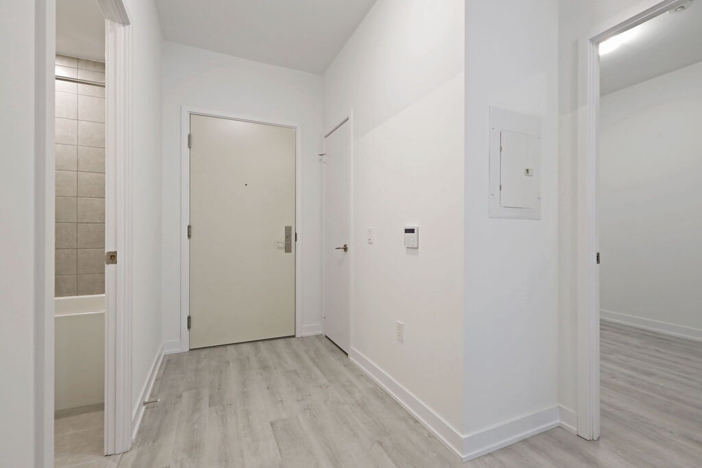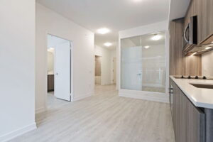 Inside, the suite unfolds with a sense of calm and intention. A dedicated entry hallway gives you privacy and breathing room the moment you walk in—an everyday detail that makes the rest of the space feel more considered. From there, the main living area opens up naturally, with room to relax, cook, work, and host without feeling crowded. Southwest exposure brings in gentle, late-day light through the Juliette balcony, adding warmth to the living space.