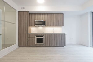 The kitchen anchors the room with clean lines and premium finishes. European-style flat-panel cabinetry with under-cabinet lighting and soft-close hardware keeps the look streamlined. Composite stone countertops and a matching backsplash add polish. And the integrated appliance package—built-in refrigerator with bottom-mounted freezer, smooth electric cook-top, convection oven, panelled dishwasher, and stainless steel microwave hood-fan—delivers both aesthetic cohesion and everyday efficiency.