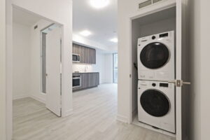Practical needs are covered without compromise: in-suite front-loading laundry, secure card-access parking, and a building designed around safety and ease. There’s 24/7 concierge and security, a fitness centre and yoga studio, co-working spaces and a boardroom, plus a shared rooftop terrace with BBQ that becomes an effortless extension of your living space in the warmer months.