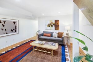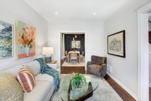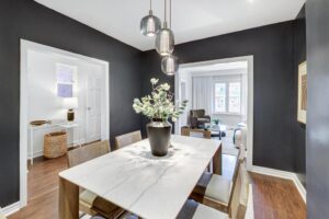 Inside, the main floor is organized around how people actually live. The living room opens naturally into a generous dining area, creating a continuous space that can shift between everyday use and hosting without needing to be rethought. It’s open where it benefits you, but still defined enough to feel intentional.